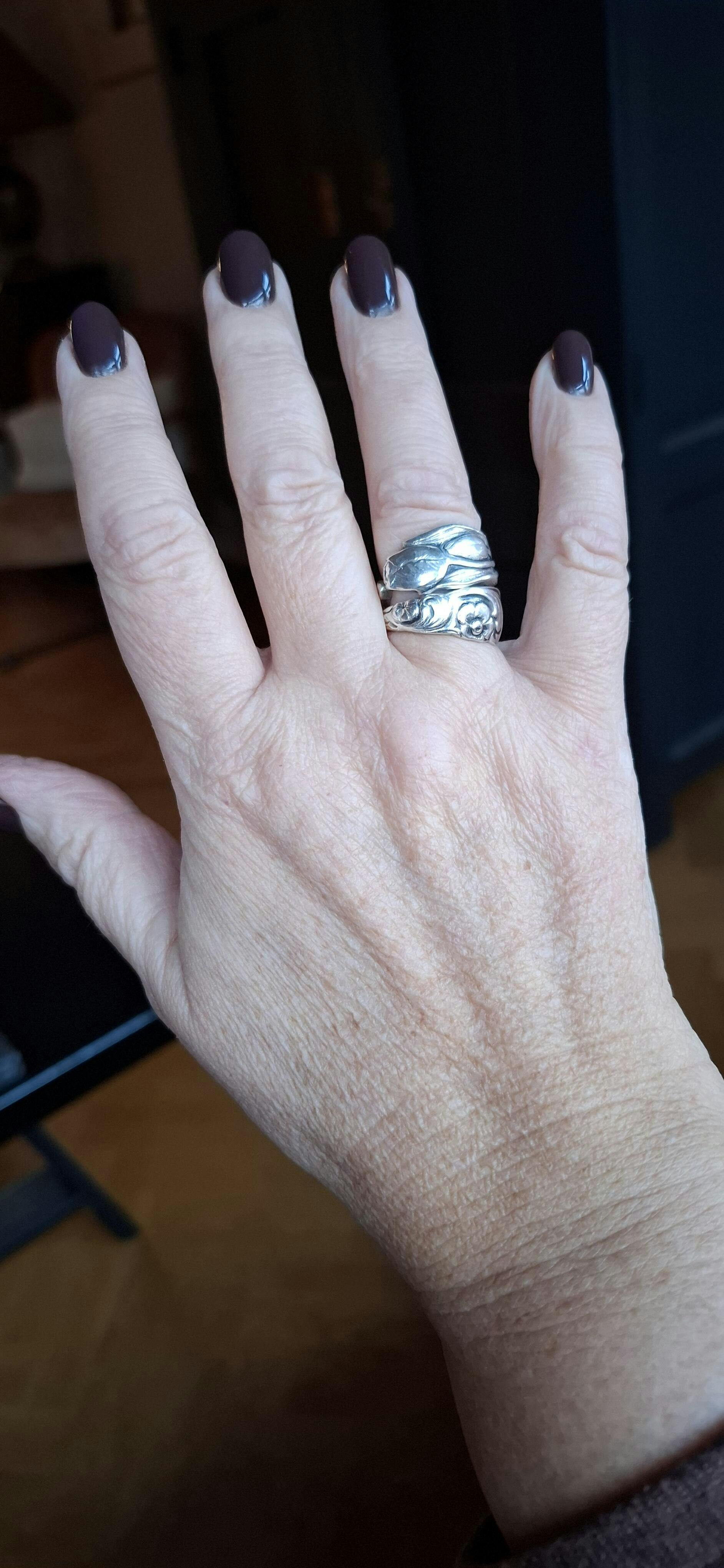 Each ring is made of silver-plated spoons, unless otherwise stated in the description. Silver-plated spoons have an outer layer of silver and a core of another metal.